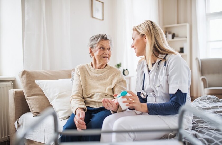 A young health visitor explaining a senior woman how to take medicine and pills. | Halfpoint - stock.adobe.com